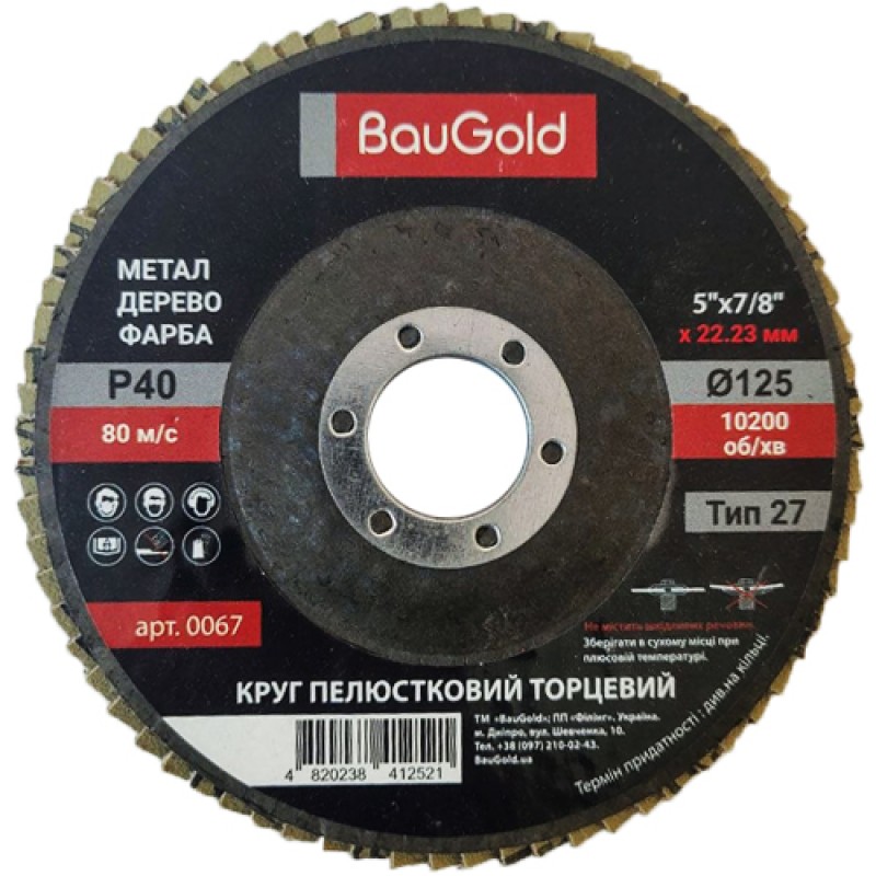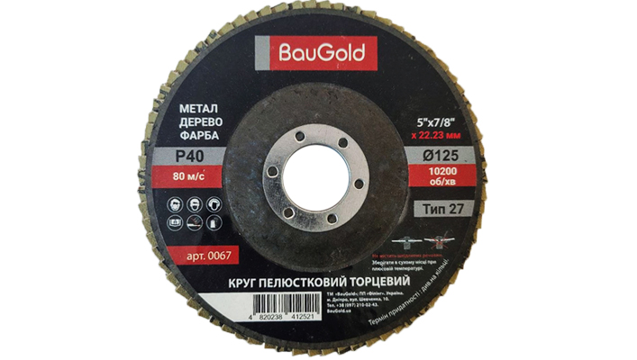 Лепестковый шлифовальный круг T27 BauGold 125×22,23 мм P40 — инструмент для грубой зачистки и интенсивного съема материала.