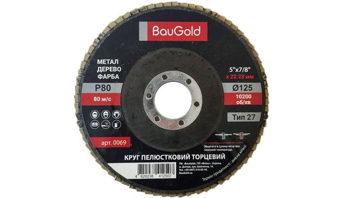 Лепестковый шлифовальный круг T27 BauGold 125×22,23 мм P80 — абразивный инструмент для универсального шлифования и промежуточной обработки поверхностей. Используется для выравнивания материала и подготовки его к финишной отделке.