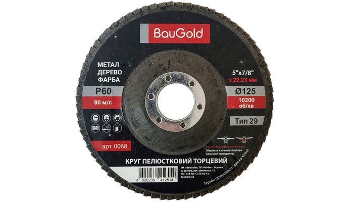 Лепестковый шлифовальный круг T29 BauGold 125×22,23 мм P60 — абразивный инструмент для промежуточного и универсального шлифования металла и других материалов. Применяется для зачистки, выравнивания поверхности и удаления следов сварки.