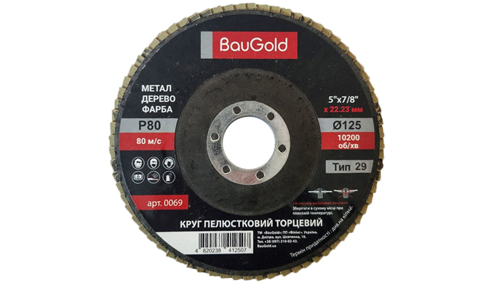 Лепестковый шлифовальный круг T29 BauGold 125×22,23 мм P80 — абразивный инструмент для универсального шлифования и промежуточной обработки поверхностей. Используется для выравнивания материала, зачистки и подготовки к финишной отделке.