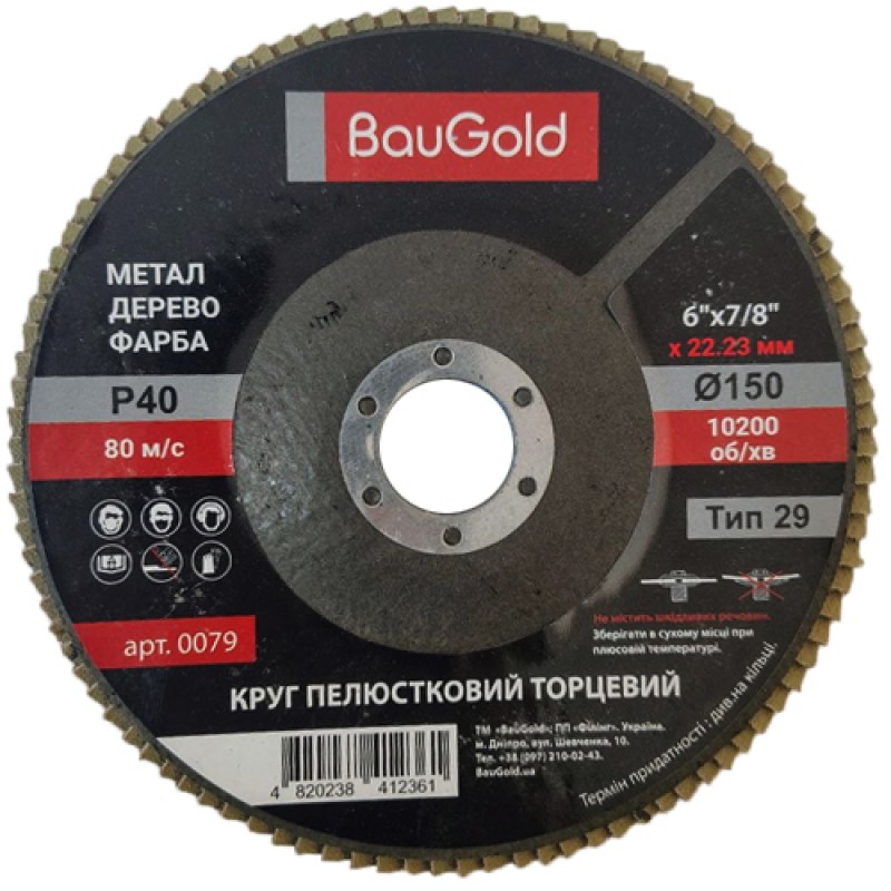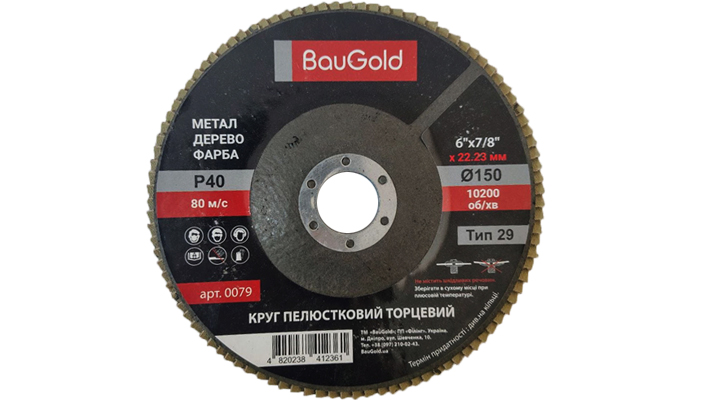 Лепестковый шлифовальный круг T29 BauGold 150×22,23 мм P40 — высокопроизводительный абразивный инструмент для грубой обработки и интенсивного съема материала. Используется для зачистки металла, удаления ржавчины, старых покрытий и обработки сварных швов.