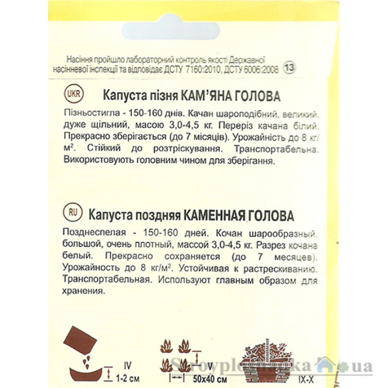 Капуста Каменная голова - позднеспелая - 150-160 дней. Кочан шарообразный, большой, очень плотный, массой 3,0-4,5кг. Разрез кочана белый. Прекрасно сохраняется (до 7 месяцев). Урожайность до 8 кг/м2. Устойчивый к растрескиванию. Транспортабельная. Используют главным образом для хранения.