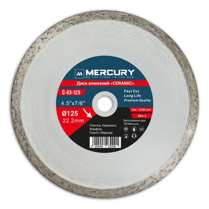 Алмазний диск CERAMIC MERCURY призначений для точного та акуратного різання керамічної плитки. Суцільна ріжуча кромка забезпечує чистий різ без сколів і тріщин, що особливо важливо під час облицювальних робіт.