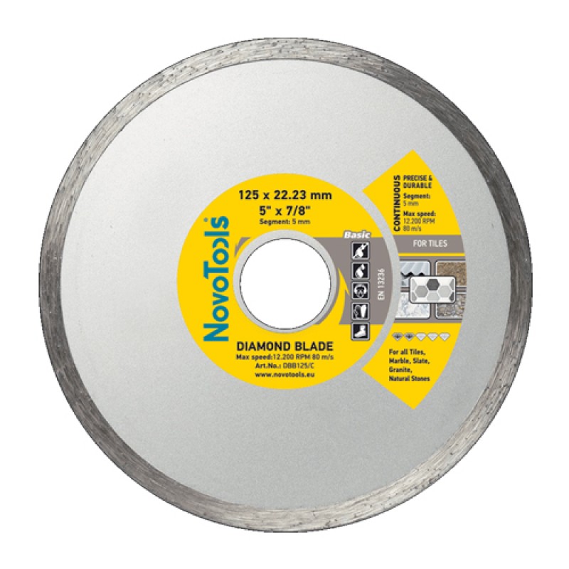 Алмазний диск NovoTools Basic призначений для точного та акуратного різання плитки та інших твердих матеріалів. Завдяки суцільному алмазному обідку забезпечує чистий різ без сколів, що особливо важливо при роботі з облицювальними матеріалами.
