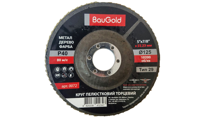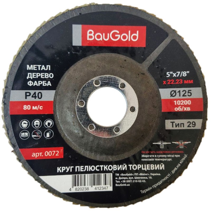 Круг пелюстковий шліфувальний T29 BauGold 125×22,23 мм P40 — високоефективний абразивний інструмент для грубої обробки металу та інтенсивного зняття матеріалу.